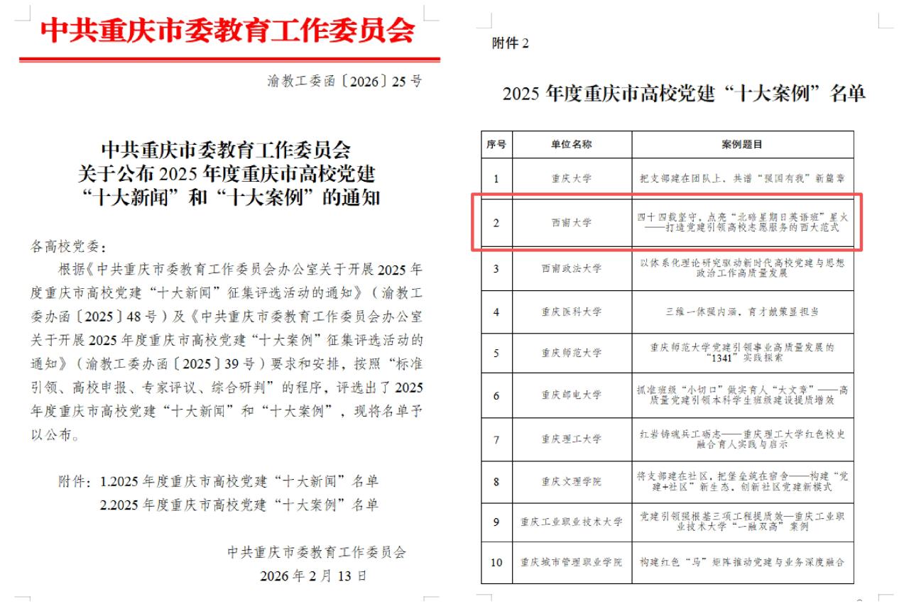 近日,中共重庆市委教育工委公布了2025年度重庆市高校党建“十大案例”评选结果。学院党委申报的《四十四载坚守,点亮“北碚...