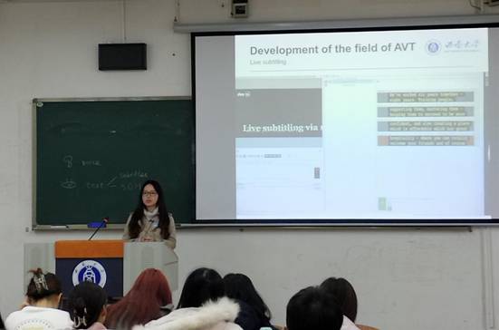 陈思佳老师根据“Development of the field of AVT(Audiovisual Translation )”这一主题,从视听翻译中两个重要的要素,voice和text出发,一步一步引导学生发现并了解这两个要素内部分支以及要素间的关系,进而把握视听翻译相关领域的发展变化。授课过程中,陈老师通过视频展示、积极互动、引导提问等教学手段,向学生们生动形象地呈现了视听翻译在不同阶段的发展形态。之后,积极引导学生进行批判性思考,联系实际生活,来考虑视听翻译的下一步发展趋势。最后,陈老师还讲到,视听翻译作为一种语言文化传递的桥梁,无论从个人、社会还是国家层面而言,都应把视听翻译的技巧与当今时代进步结合,充分为人类所利用。
