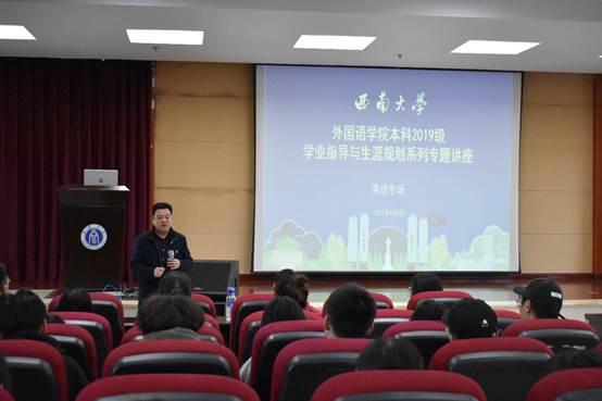 2021年4月9日下午,西南大学best365英国在线体育官网于5教903成功举办 “脚踏实地,仰望星空——争做新时代外语人才”主题讲座,该讲座为best365英国在线体育官网本科2019级学业指导与生涯规划系列专题讲座的英语专场。学院副院长褚修伟作主讲人,本科2019级辅导员许安琪和本科2019级英语专业全体学生聆听了本次讲座。