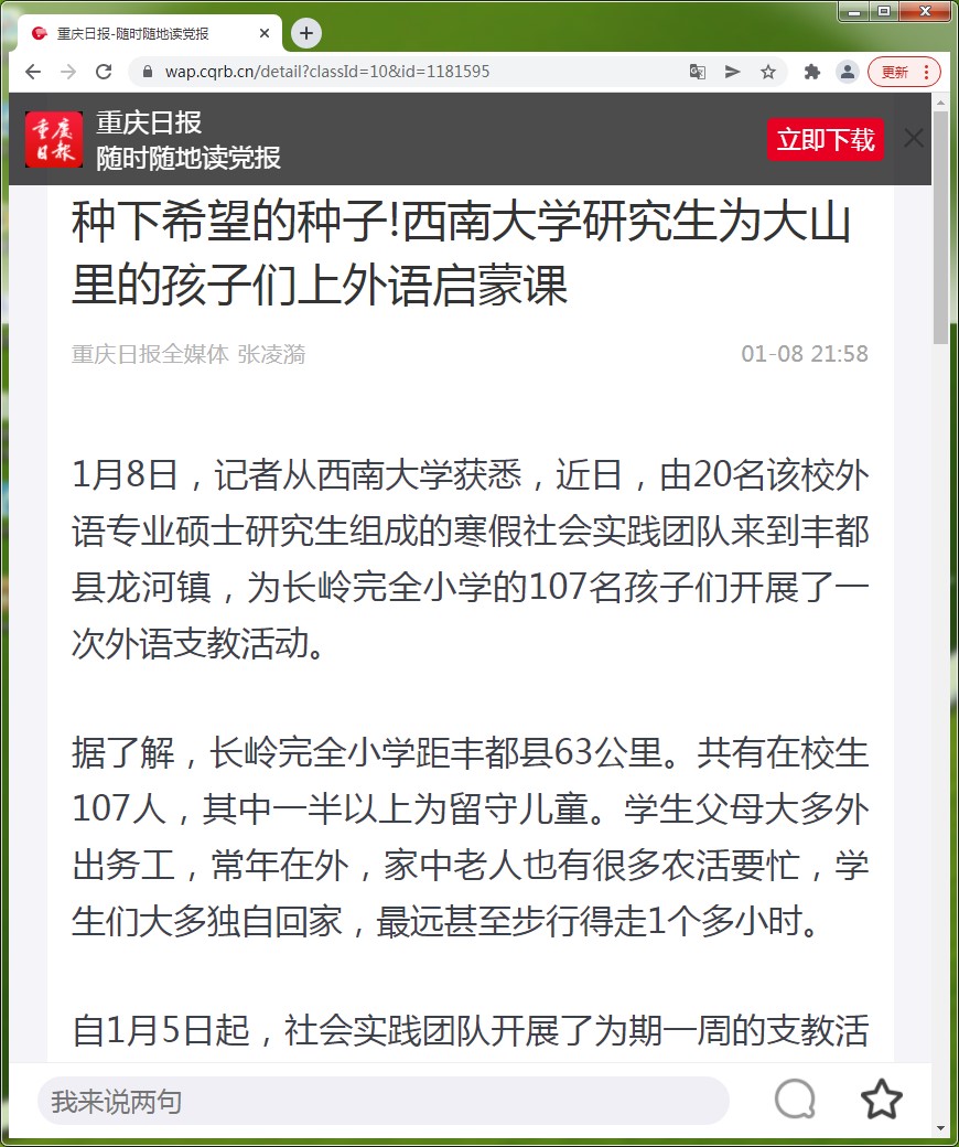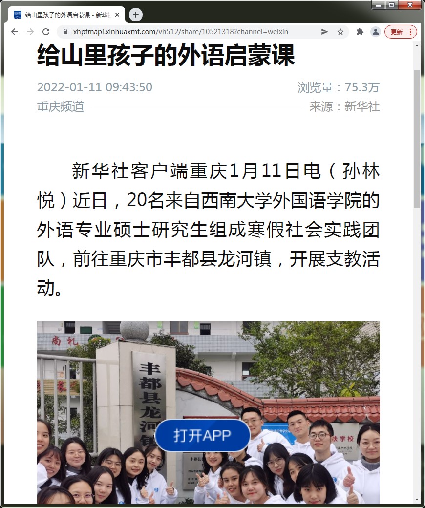 据统计,截至1月12日,共有9个宣传媒体对此次支教活动进行报道。新华社:《给山里孩子的外语启蒙课》,中国新闻网:《重庆丰都:以教育之笔描绘乡村振兴新画卷》,重庆日报:《种下希望的种子!西南大学研究生为大山里的孩子们上外语启蒙课》,重庆欧美同学会青委会相继报道了此次活动。我院对本次社会实践活动还进行了跟踪报道,实时更新资讯,在2个微信公众平台上发布了6期资讯,并有4期同步发布在西南大学党委研究生工作部新闻网;此外,西南大学新闻网,“西南大学研究生教育”微信公众平台也相继发布了相关报道。