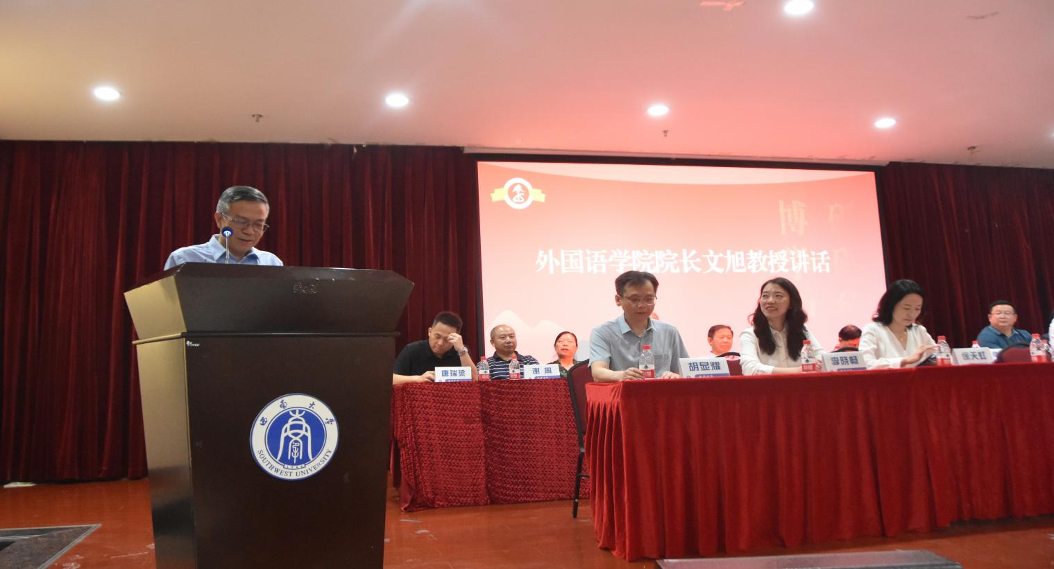 最后,学院院长文旭教授作了讲话。文院长对新生的到来表示热烈的欢迎和祝贺,对学院的基本情况作了详细的介绍,也对新生提出了四点要求,希望大家争做“四有”新人。