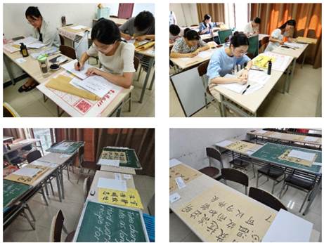 三笔字书写环节,12位选手在402教室按照指定内容,进行粉笔字、硬笔字和毛笔字的书写比赛。