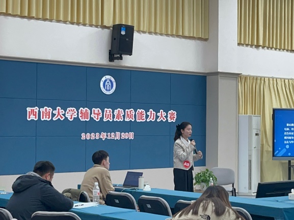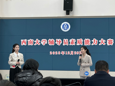 西南大学2023年辅导员素质能力大赛决赛于2023年12月29日在学生处420会议室举行。经过案例分析和谈心谈话两个环节的激烈角逐,学院辅导员王秋菊荣获一等奖,辅导员王翠玉荣获二等奖。