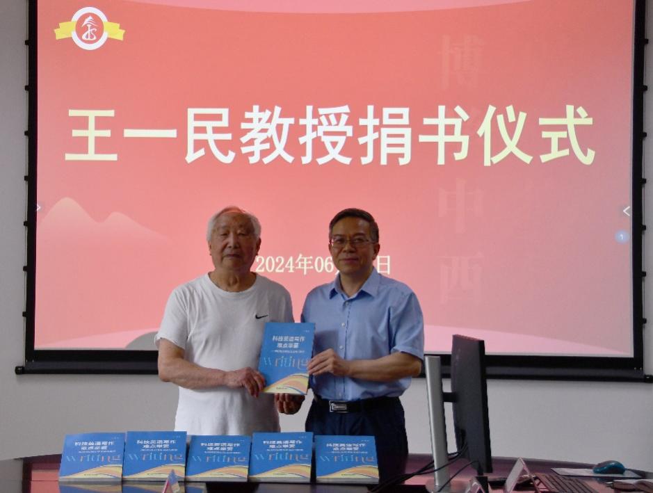 2024年6月17日,一场庄重而温馨的捐书仪式在学院313会议室举行,学院87岁高龄退休老教师王一民教授,将他近期出版的学术专著《科技英语写作难点举要——我国科技期刊英文病句解析》捐赠给学院。捐赠仪式由学院院长文旭教授主持,学院领导及教师代表出席了此次活动。