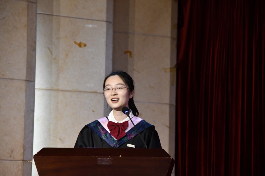 在毕业典礼上,毕业生代表、英语专业公费师范生张佳欣与大家分享了在大学时光里如何追寻前辈的足迹,亲手描绘自己教育理想蓝图的感人故事,并对母校和母院表达了最真挚的感谢,对老师、家人和相伴四年的同学们给予最深情的祝福。