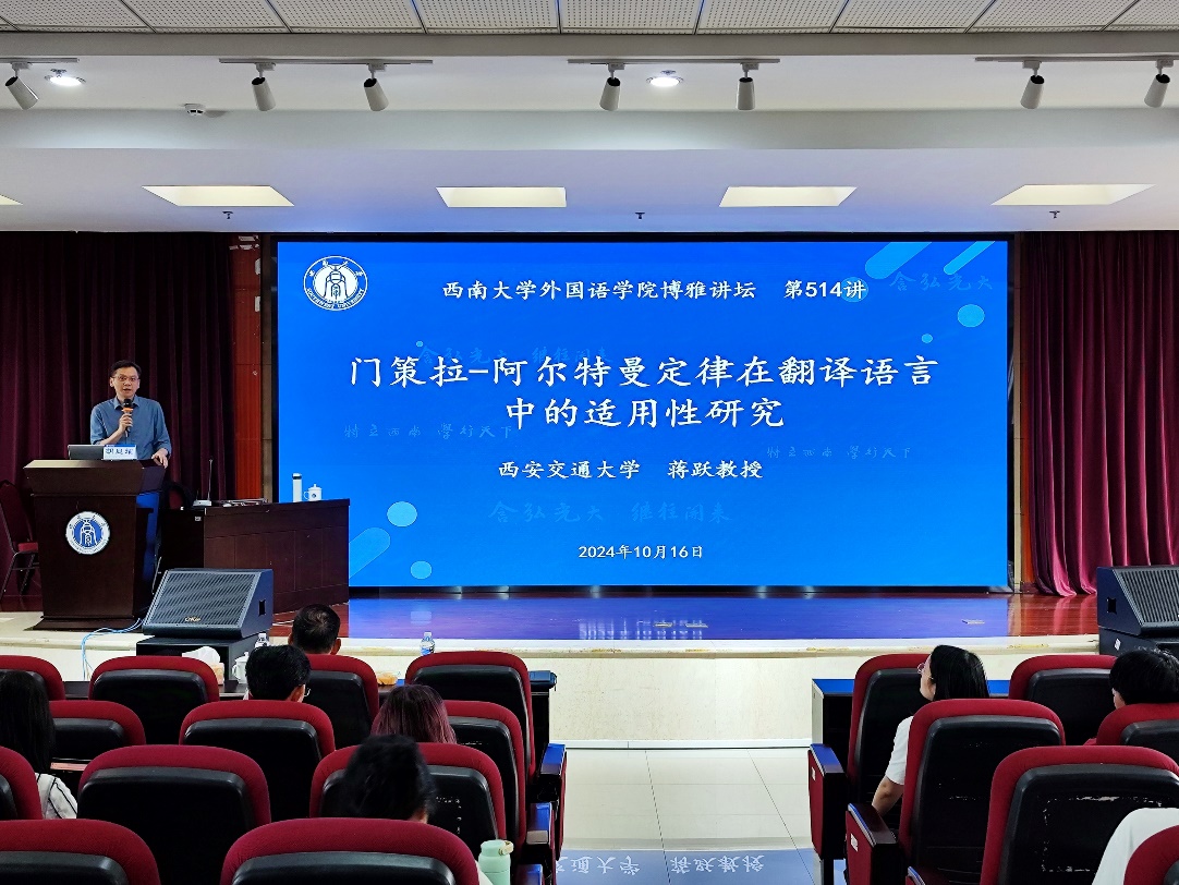 10月16日下午,西安交通大学博士生导师蒋跃教授应邀做客学院博雅讲坛, 于best365英国在线体育官网903学术报告厅开展了题为“门策拉-阿尔特曼定律在翻译语言中的适用性研究”的讲座。本次讲座由best365英国在线体育官网副院长、博士生导师胡显耀教授主持。