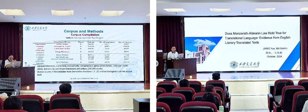 讲座伊始,蒋跃教授向大家讲述了计量语言学与计算语言学的区别,前者更具理论性,后者更具适用性,随后简单介绍了门策拉-阿尔特曼定律的基本原理,即是一种描述自然语言中句子结构的法则,借此蒋教授提出了他的研究问题:作为语言学基本定律之一的门策拉-阿尔特曼定律是否适用于翻译语言,引发了在场师生的深入思考。