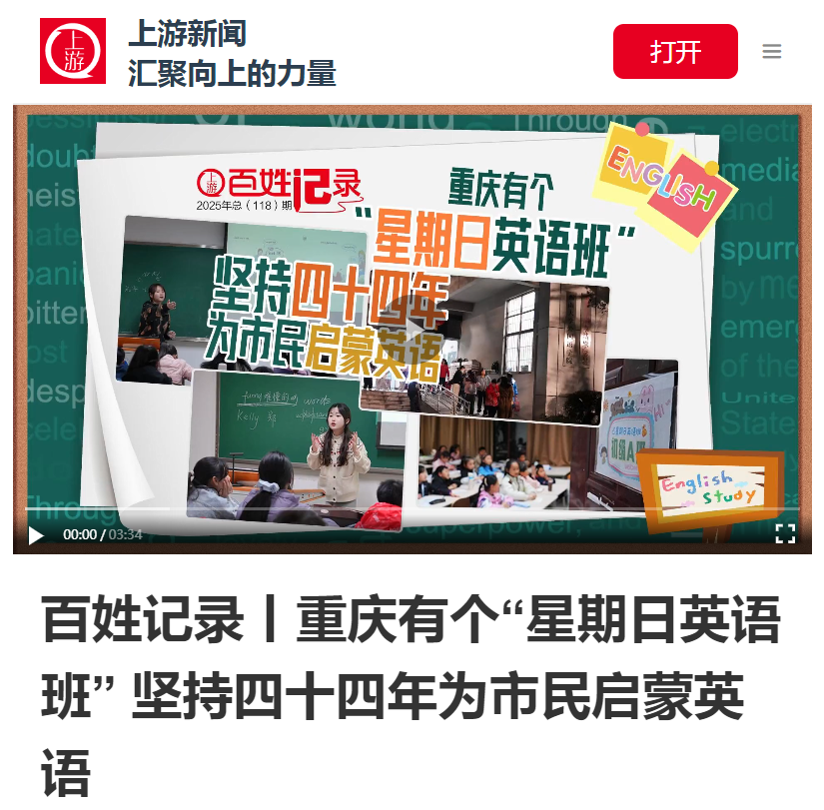 4月11日,上游新闻率先发力,在其“百姓记录”系列视频中推出题为《重庆有个“星期日英语班”坚持四十四年为市民启蒙英语》的专题内容。通过生动的影像记录,向大众展现了这一坚持44年之久的英语启蒙班的独特魅力与深厚底蕴。