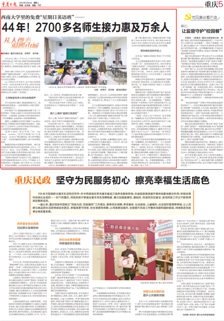 5月6日,重庆日报再次以深度报道的形式,单独刊发《西南大学里的免费“星期日英语班”——44 年!2700 多名师生接力惠及万余人》一文,对我院“星期日英语班”公益项目进行全方位解读。报道版面还精心配发了现场图片,画面中学生志愿者与小朋友们积极互动的场景,生动展现了这一项目的温暖与成效,让读者仿佛身临其境。