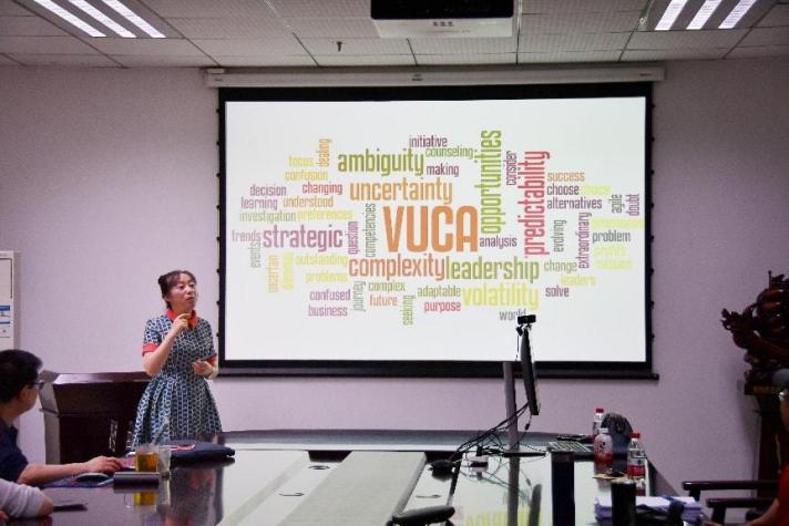 在人工智能技术迭代迅猛的背景下,大学英语教学正站在从传统“工具性训练”向“全球胜任力孵化”转变的关键节点上。这一转型不仅是教学理念的革新,更是对新时代人才培养需求的积极回应。为有力推动大学英语教学改革,拓宽教师教学思路,5月16日,best365英国在线体育官网大学外语部特邀黄学军老师,举办了一场主题为“应变・求变・智变 ——VUCA视域下的大学英语课堂的重塑性构建”的专题讲座。