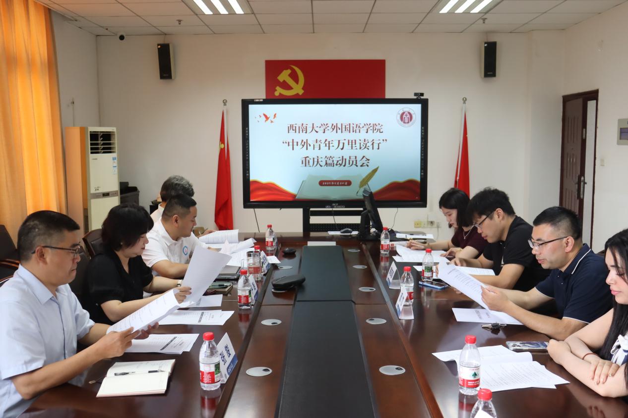 为全面强化学院党建工作效能,提升党建工作质量,推动学院外国语言学及应用语言学硕士生党支部与西部国际传播中心基层党组织的深度结对共建,高质量推进“中外青年万里读行”重庆篇视频拍摄活动,8月24日10:30,学院于307会议室召开专项动员会。学院党委书记严怡、党委副书记纪委书记梅胜利、副院长张俊、特聘教授孟凡君、外事秘书杨竹、学生工作办公室主任兼团委书记黄亦豪、专职辅导员王翠玉、外籍教师Deborah Grace Hearne及全体外籍特邀嘉宾出席会议,会议由学院党委副书记、纪委书记梅胜利主持。