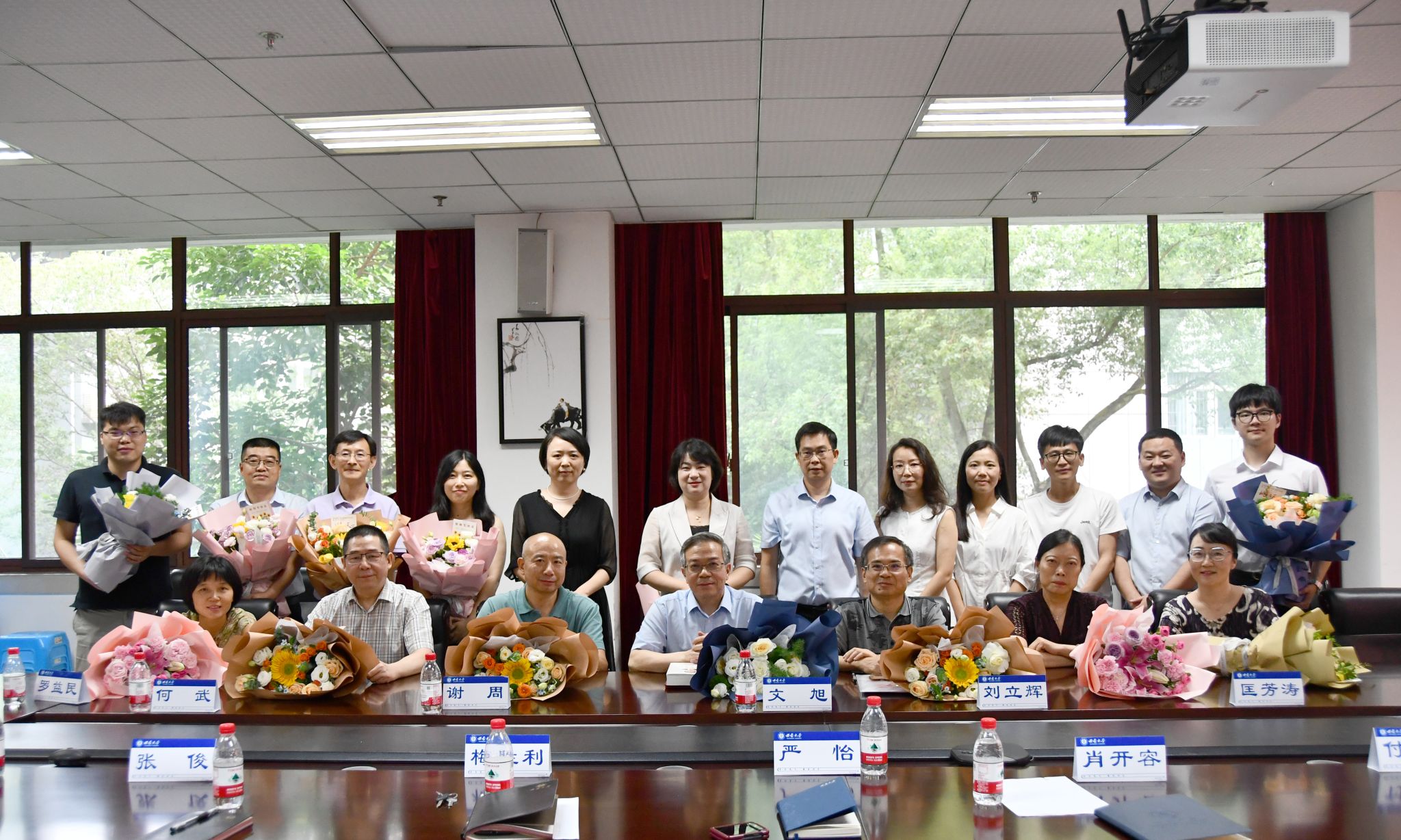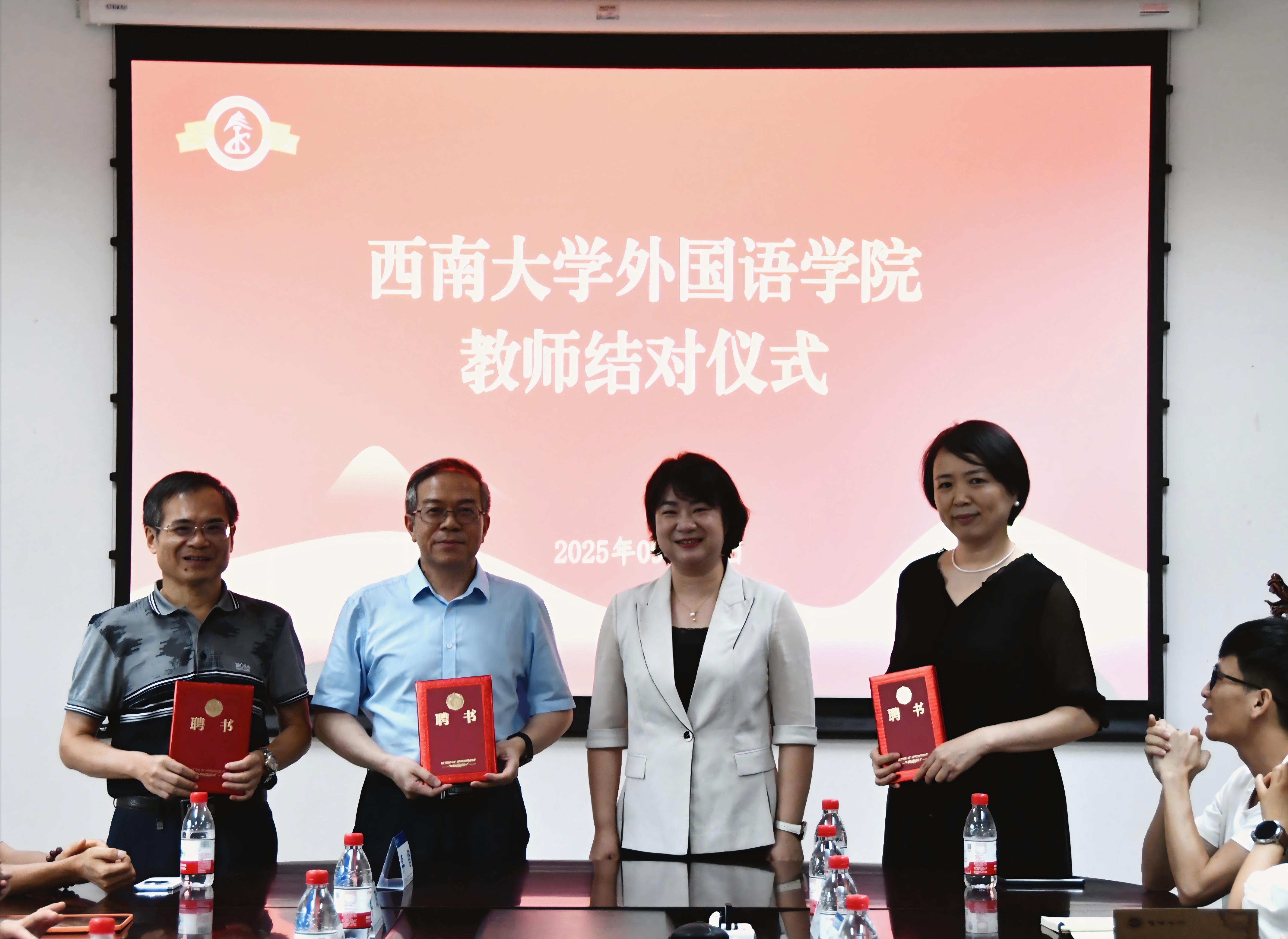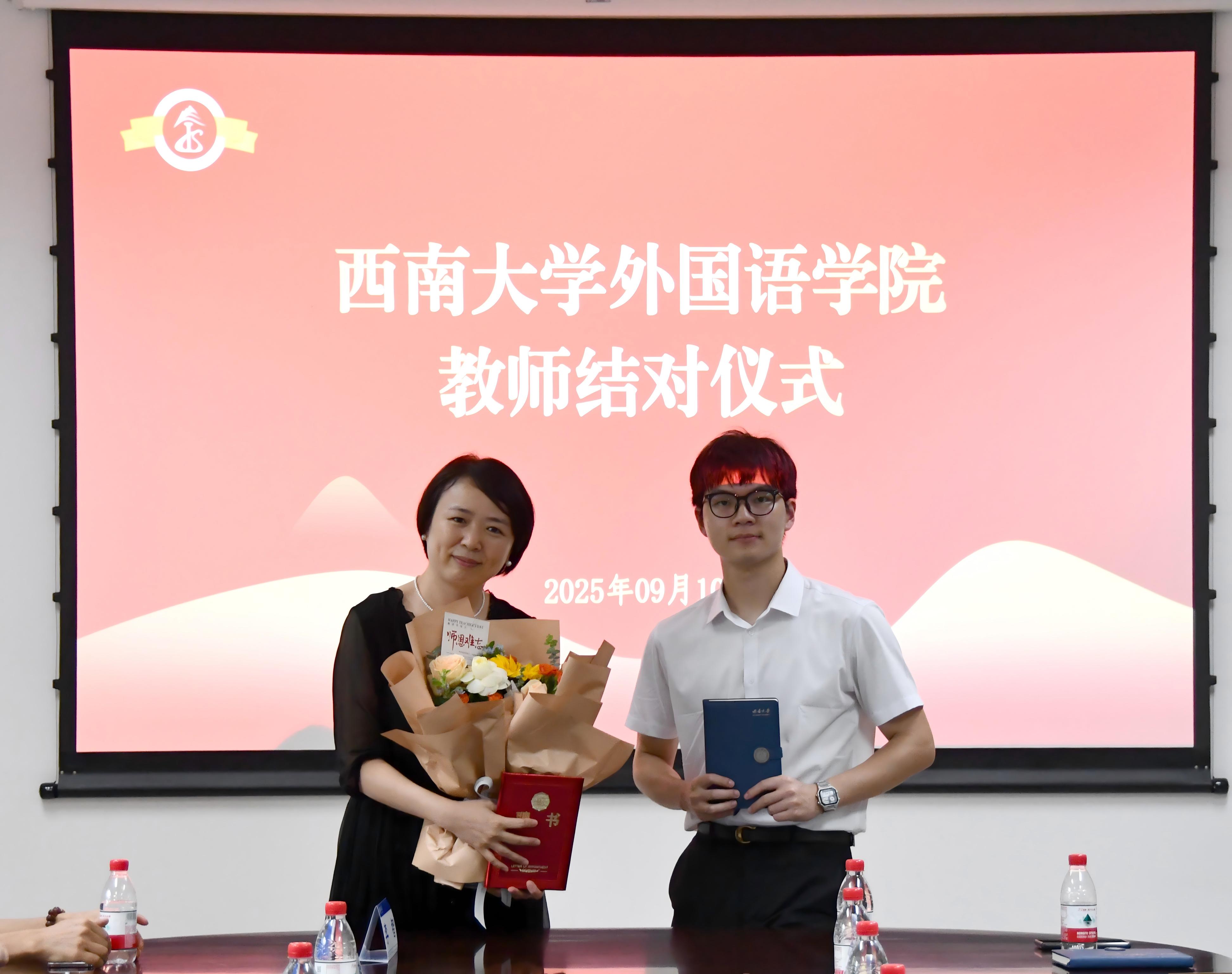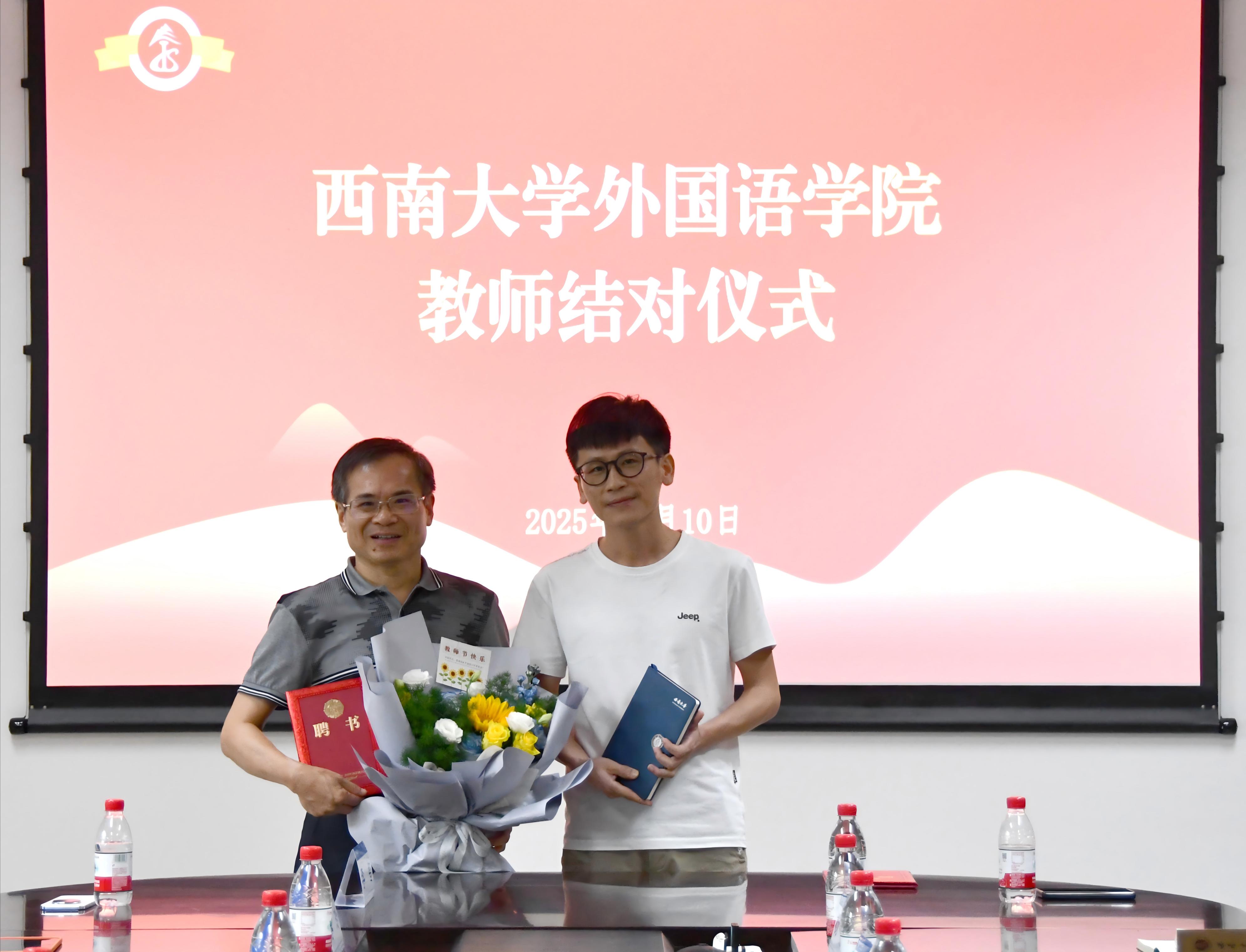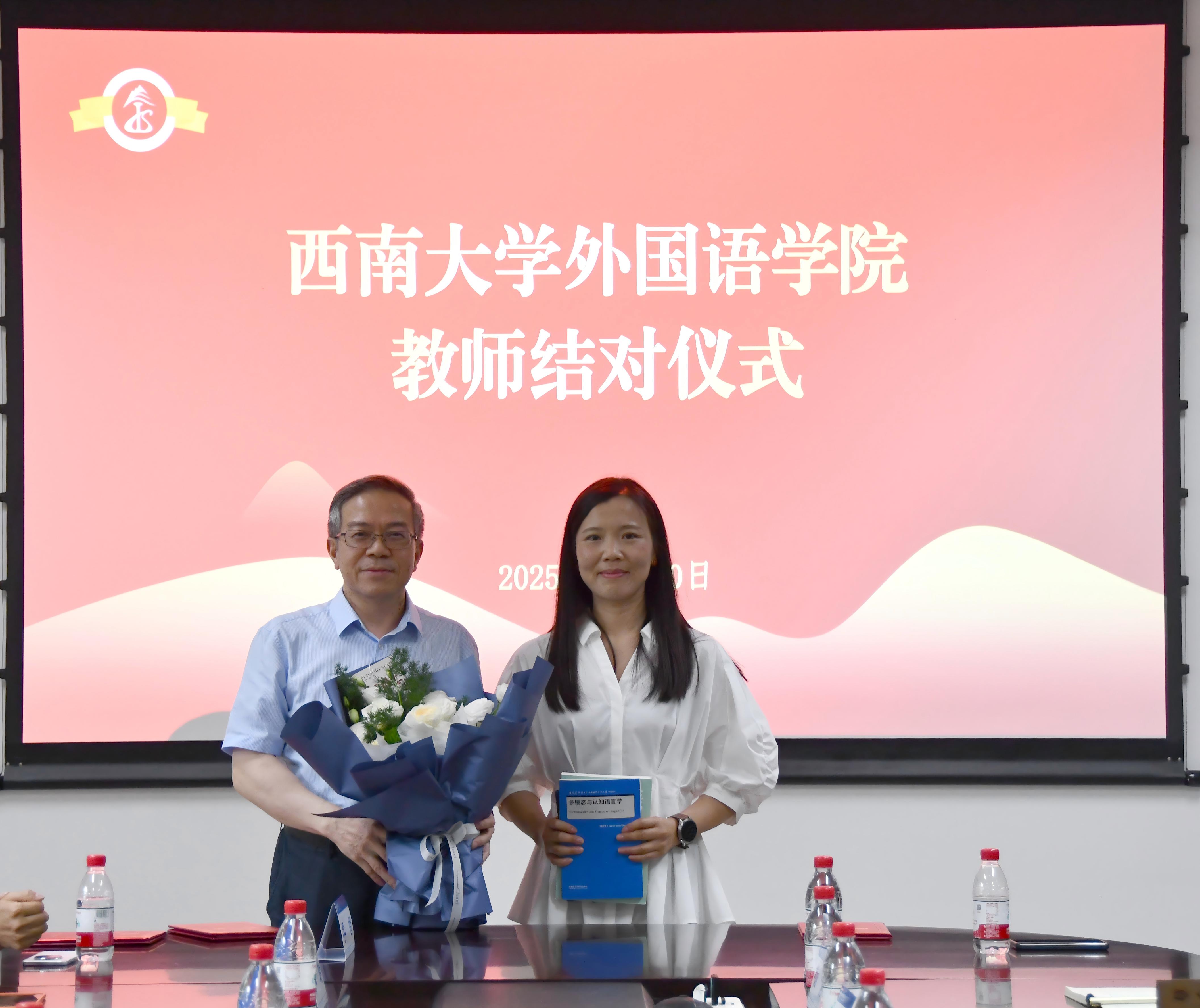 在教师结对仪式环节,新老教师携手并肩,互赠书籍与鲜花,传承教学经验与育人智慧。指导教师文旭教授寄语青年教师,殷切勉励大家要始终坚守育人初心,将培育人才视为教育工作的根本使命;深耕专业领域,不断提升自身的学术造诣与专业水平;同时,要在教育教学的实践中持续积累经验,积淀教育智慧,为教育事业的发展贡献力量。这一仪式不仅体现了学院重视师资梯队建设的优良传统,更彰显了外院人“传、帮、带”的精神纽带,为学院教师队伍建设注入新的活力。