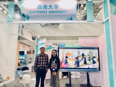 在高校展馆内,我校学生积极展现西南大学的教育创新成果与教育领域的课题研究,在现场获得我校常务副校长宋乃庆教授的鼓励与肯定,并在特别活动上与外籍学者热情交流。