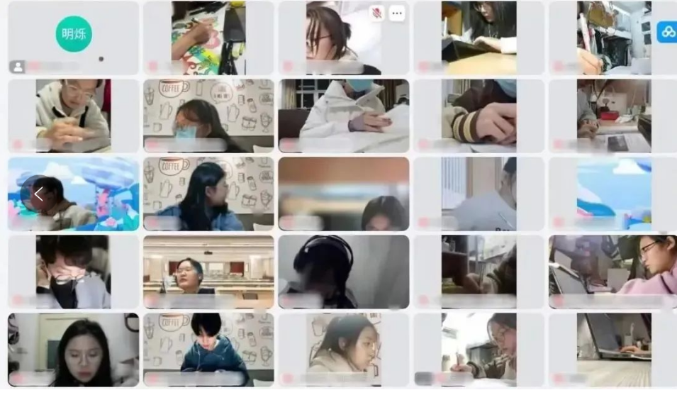 一、同学们通过“飞书”app进入自习室,打开摄像头认真学习。