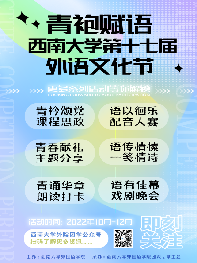 你是否曾用外语写尽人间浪漫却无人欣赏呢?是否想展现外国文学与戏剧的不朽魅力却没有舞台呢?此刻就现在!外文节将一一实现你的梦想!在这里,你可以尽情发挥自己的激情与活力,我们有绚丽的舞台,有热情的观众,更有志同道合的小伙伴等你来相遇!配音大赛,朗读打卡,谁说你的戏剧演绎不会赢得满堂喝彩,谁说你的一首情诗不能惊艳整段时光!不仅如此,本届外文节还有课程思政、主题班会分享等活动。用文化丰盈自我,以青春献礼祖国!大家还在犹豫什么?快快带上所有期待,外文节,等你来!