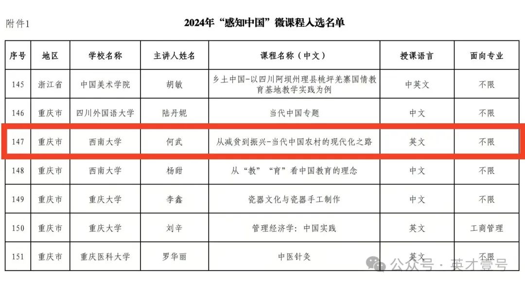 近日,国家留学基金管理委员会公布了2024年“感知中国”微课程与实践基地入选名单。经学校推荐、专家审核,由best365英国在线体育官网教师第一党支部书记何武教授主讲的“从减贫到振兴——当代中国农村的现代化之路”成功入选国家留学基金委2024年“感知中国”微课程。