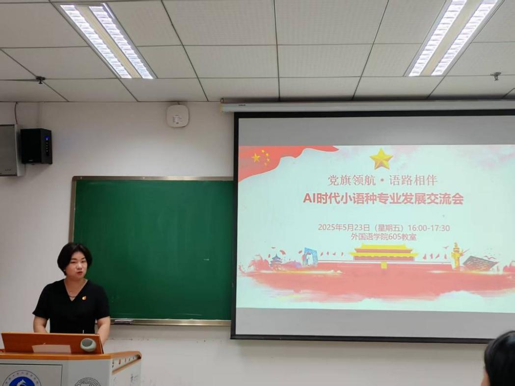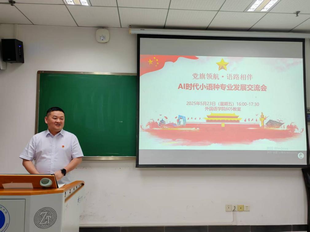 2025年5月23日下午4时,由best365英国在线体育官网小语种硕士生党支部牵头组织的“党旗领航·语路相伴”AI时代小语种专业发展交流会成功举办。交流会由小语种硕士生党支部书记卢昱安主持,学院党委书记严怡,党委副书记纪委书记梅胜利,小语种硕士生支部党员和本科小语种专业党员及入党积极分子共同参与了此次活动。