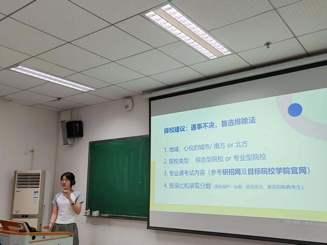 2022 级日语语言文学硕士生夏玉琳围绕“考公”背景下毕业生信息获取、岗位选择与备考策略进行了分享。她表示,毕业季的学生面临着就业、考研、考公等多种选择,同学们要学会从海量信息中筛选出可靠、有用的内容,避免被虚假信息误导。她鼓励同学们要勇于面对挑战,将个人的发展与国家和基层的需求紧密结合起来。她衷心祝愿同学们能够勇敢自信地迎接考公之路上的种种困难,为实现个人价值和社会价值而努力奋斗。